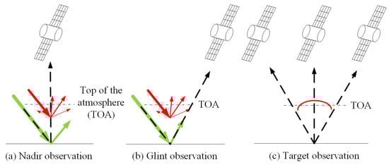 The observation modes of GAS-2. (a) Nadir observation mode; (b) glint observation mode; (c) target observation mode.