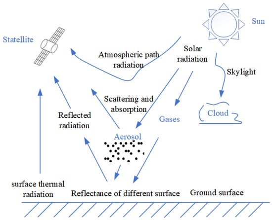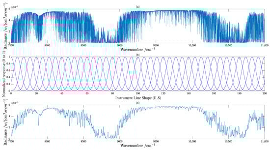 Schematic representation of the convolution of the upwelling radiance spectrum with the instrument line shape (ILS). (a) The upwelling radiance spectrum obtained with MODTRAN5.2.1; (b) The instrumental line shape (ILS) function of the spectral channel; (c) Spectral radiance acquired by the instrument, which is the convolution of (a,b).