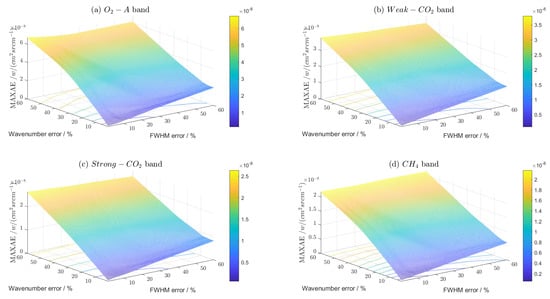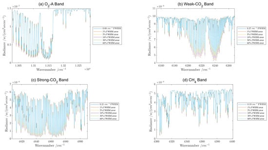 Comparison of the spectral radiance of the FWHM error obtained from calibration sources with different linewidths. (a) The spectral radiance obtained via GAS-2 in the -A band with FWHM errors of 1%, 5%, 10%, 30%, and 60% due to calibration light source’s linewidth, respectively; (b) the spectral radiance obtained via GAS-2 in the weak- band with FWHM errors of 1%, 5%, 10%, 30%, and 60% due to calibration light source’s linewidth, respectively; (c) the spectral radiance obtained via GAS-2 in the strong- band with FWHM errors of 1%, 5%, 10%, 30%, and 60% due tocalibration light source’s linewidth, respectively; (d) the spectral radiance obtained via GAS-2 in the band with FWHM errors of 1%, 5%, 10%, 30%, and 60% due to calibration light source’s linewidth, respectively.