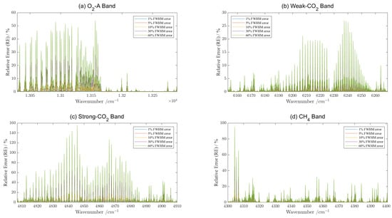 Comparison of relative error (RE) of spectral radiance obtained via GAS-2 in four bands with different FWHM errors of 1%, 5%, 10%, 30%, and 60%. (a) -A band, the relative error (RE) of spectral radiance; (b) weak- band, the relative error (RE) of spectral radiance; (c) strong- band, the relative error(RE) of spectral radiance; (d) band, the relative error (RE) of spectral radiance.