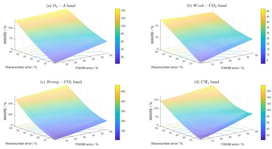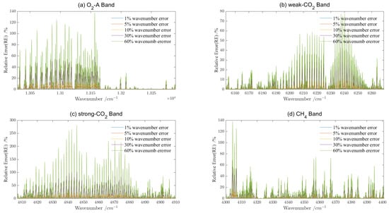 Comparison of relative error (RE) of spectral radiance acquired via GAS-2 due to 1%, 5%, 10%, 30%, 60% shift in center wavelength. (a) -A band, the relative error (RE) of spectral radiance due to central wavelength shift; (b) weak- band, the relative error (RE) of spectral radiance due to central wavelength shift; (c) strong- band, the relative error (RE) of spectral radiance due to central wavelength shift; (d) band, the relative error (RE) of spectral radiance due to central wavelength shift.