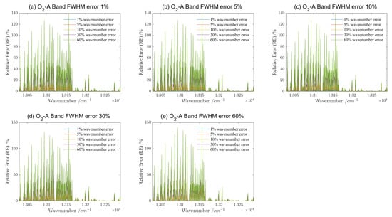 Comparison of relative error (RE) of spectral radiance acquired via GAS-2 in four bands due to 1%, 5%, 10%, 30%, 60% shift in center wavelength and 1%, 5%, 10%, 30%, 60% spectral resolution (FWHM) error in -A band. (a) -A band, relative error (RE) of spectral radiance due to different wavelength errors when the FWHM error is 1%; (b) -A band, relative error (RE) of spectral radiance due to different wavelength errors when the FWHM error is 5%; (c) -A band, relative error (RE) of spectral radiance due to different wavelength errors when the FWHM error is 10%; (d) -A band, relative error (RE) of spectral radiance due to different wavelength errors when the FWHM error is 30%; (e) -A band, relative error (RE) of spectral radiance due to different wavelength errors when the FWHM error is 60%.