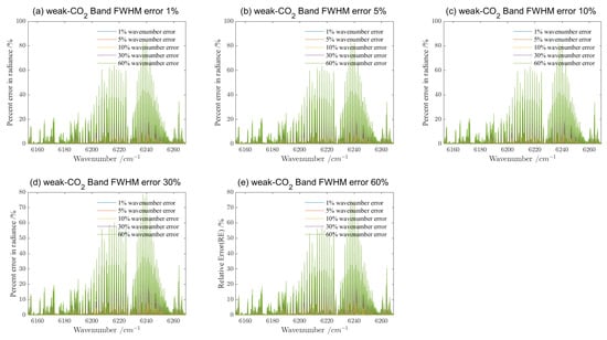 Comparison of relative error (RE) of spectral radiance acquired via GAS-2 in four bands due to 1%, 5%, 10%, 30%, 60% shift in center wavelength and 1%, 5%, 10%, 30%, 60% spectral resolution (FWHM) error in weak- band. (a) weak- band, relative error (RE) of spectral radiance due to different wavelength error when the FWHM error is 1%; (b) weak- band, relative Error (RE) of spectral radiance due to different wavelength error when the FWHM error is 5%; (c) weak- band, relative error (RE) of spectral radiance due to different wavelength error when the FWHM error is 10%; (d) weak- band, relative error (RE) of spectral radiance due to different wavelength error when the FWHM error is 30%; (e) weak- band, relative error (RE) of spectral radiance due to different wavelength error when the FWHM error is 60%.