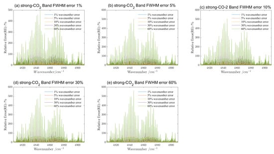 Comparison of relative error (RE) of spectral radiance acquired via GAS-2 in four bands due to 1%, 5%, 10%, 30%, 60% shift in center wavelength and 1%, 5%, 10%, 30%, 60% spectral resolution (FWHM) error in strong- band. (a) strong- band, relative error (RE) of spectral radiance due to different wavelength error when the FWHM error is 1%; (b) strong- band, relative error (RE) of spectral radiance due to different wavelength error when the FWHM error is 5%; (c) strong- band, relative error (RE) of spectral radiance due to different wavelength error when the FWHM error is 10%; (d) strong- band, relative error (RE) of spectral radiance due to different wavelength error when the FWHM error is 30%; (e) strong- band, relative error (RE) of spectral radiance due to different wavelength error when the FWHM error is 60%.