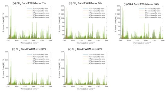 Comparison of relative error (RE) of spectral radiance acquired via GAS-2 in four bands due to 1%, 5%, 10%, 30%, 60% shift in center wavelength and 1%, 5%, 10%, 30%, 60% spectral resolution (FWHM) error in band. (a) band, relative error (RE) of spectral radiance due to different wavelength error when the FWHM error is 1%; (b) band, relative error (RE) of spectral radiance due to different wavelength error when the FWHM error is 5%; (c) band, relative error (RE) of spectral radiance due to different wavelength error when the FWHM error is 10%; (d) band, relative error (RE) of spectral radiance due to different wavelength error when the FWHM error is 30%; (e) band, relative error (RE) of spectral radiance due to different wavelength error when the FWHM error is 60%.