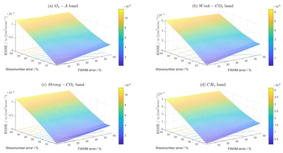 Comparison of RMSE results of spectral radiance acquired via GAS-2 in four bands due to wavelength stability and linewidth of the calibration light source. (a) -A band, the RMSE results of spectral radiance due to two factors operating simultaneously; (b) weak- band, the RMSE results of spectral radiance due to two factors operating simultaneously; (c) strong- band, the RMSE results of spectral radiance due to two factors operating simultaneously; (d) band, the RMSE results of spectral radiance due to two factors operating simultaneously.