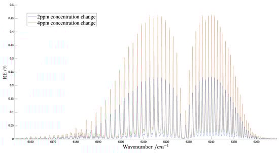 Relative error in spectral radiance for 2 ppm and 4 ppm changes in atmospheric concentration.