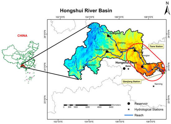 The Hongshui River is the primary tributary of the Xijiang River in the Pearl River basin, endowed with vast hydroelectric potential and located in southwest China, as shown in Figure 1. The drainage basin has an area of 98,500 km2 [66]. The main channel is divided into different river channels: Qianjiang, Nanpanjiang, Beipanjiang, and Hongshuihe [67]. Typically, the basin is dry and tropical, with sufficient precipitation and a high air temperature. Temperatures average between 14.5 and 22.6 °C, and yearly precipitation falls between 750 and 1800 mm. Precipitation peaks between April and October, accounting for 70–85% of annual precipitation [68]. The primary source of the Hongshui River in Qujing, Yunnan Province, is Mount Maxiong. It runs south and northeast along the boundary between Guizhou and Guangxi before entering the Beipan River. The river’s name changes to Hongshui River below this point. It then runs for 215 km in northern Guangxi until joining the main stem of the Yu River at Guiping (345 km). The Liu River, its most significant tributary, flows into it just below Laibin (Laiping). The Hongshui River and its tributaries drain almost all of southern Guizhou and northern Guangxi.