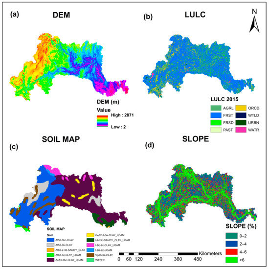 (a) DEM; (b) LULC; (c) soil map; (d) slope of HRB.