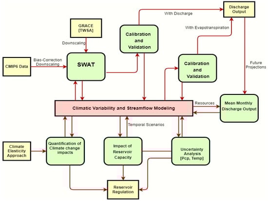 The key goals of this investigation are to (1) investigate the effects of climate change on the hydrological parameters and streamflow integrating general circulation models that participated in the sixth phase of the Coupled Model Intercomparison Project (CMIP6) and GRACE data with SWAT; (2) quantify the contribution of climate change to the change in streamflow by using the climate elasticity method (CEM). This research is significant in comprehending how climate influences streamflow evolution. This study will also help policymakers understand how the streamflow responds to a changing climate and provide promising findings for future water resource management techniques.