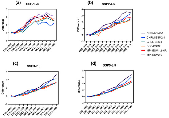 Annual mean temperature projections over the HRB were evaluated, and an ensemble of GCMs showed a rise of nearly 2 °C; nonetheless, GCMs differ in how they project monthly temperature increases. The results correspond to other regional studies; the average temperature over South Asia is projected to increase by 0.8 °C, 0.9 °C, and 1.2 °C in the near future period; 1.2 °C, 1.8 °C, and 2.9 °C, throughout the mid-future period; 1.2 °C, 2.1 °C, and 4.3 °C for the far period under the low, medium, and high SSPs, respectively [19]. Neighboring country Nepal will likely observe an increase of 1.7–3.6 °C by 2100 [104].
