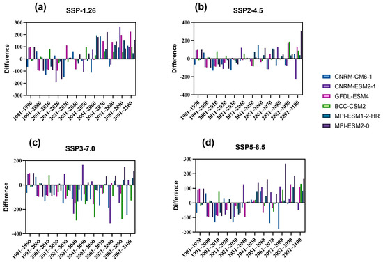 Decade-wise time series plot of the difference in precipitation compared to the historically observed precipitation of GCM members from the CMIP6 outputs.