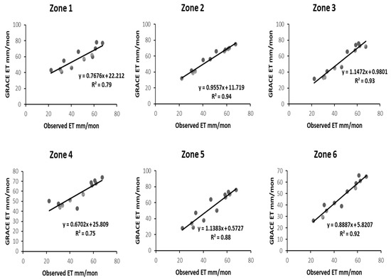 Validation of the GRACE ET data, as represented in Figure 8, allowed us to assess the accuracy and reliability of the data. This validation process involved comparing the GRACE ET data with the observed ET data and assessing the level of agreement between them. Through this validation process, we were able to better understand and account for the uncertainties associated with the GRACE ET data in our analysis. Due to the availability of remotely sensed data, the water balance method is often used to estimate ET at the basin scale and over months or even coarser periods. The ds/dt obtained only from the GRACE mission is depicted in Figure 9b. The ET data were evaluated for the six distinct zones described in Figure 9a,c represents the mean distribution of monthly ET data over six zones of study area. The drainage basin had an area of 98,500 km2. The area of the six zones varied from 10,000 km2 to 20,000 km2. These locations included the basin area and sites close to achieving more precise findings during the simulations. Because of the variations, the importance of ET in this region is particularly noteworthy.