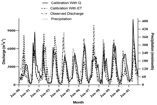 Figure 10 depicts the link between the simulation discharge and evapotranspiration and the association between the simulation discharge and precipitation. The R2 and NSE statistical parameter indices offered satisfactory findings, with 0.78 and 0.80, respectively. The results extracted from Figure 10 showed that the peaks of the calibrated discharge were slightly greater than the peaks of calibration with ET. These larger peaks suggest that the data gathered by remote sensing for evapotranspiration were overestimated.