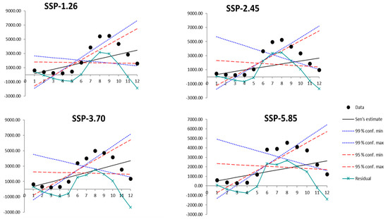 Sen’s estimate, a minimum and maximum confidence level of 99% and 95%, and the residual data of the simulated mean monthly discharge (CMS) from each of the four scenarios.