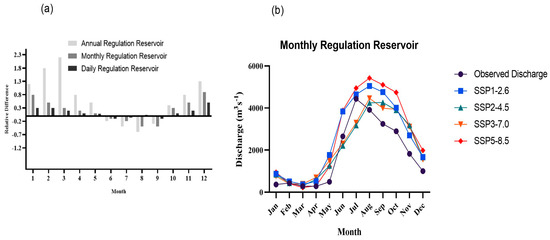 The effect evaluation of reservoir capacity on streamflow in the Hongshui River basin was examined through the lens of four distinct scenarios. Table 1 contains information on the parameters of the reservoirs, while Figure 1 presents the data regarding the locations of the reservoirs. Scenario 1 is the standard, natural-based situation scenario that is a benchmark against which other scenarios may be assessed. Figure 12a shows the mean monthly discharge at the Qianjiang outlet; the other three scenarios are yearly, monthly, and daily regulatory reservoirs. The absolute difference between the mean monthly discharge with and without reservoirs divided by the monthly average flow without reservoirs yields a relative difference. From May through October, the MMD with the reservoir was only slightly higher than the natural monthly average flow, as shown in Figure 12b, with January and March seeing the greatest spike. In addition, increasing capacity resulted in more runoff throughout the dry season. The dry season significantly increased the monthly average flow to the yearly regulation reservoir. At the height of the flood season, from June to September, the annual regulatory reservoir effectively mitigated flood damage. The monthly and daily regulation reservoir induced a decrease in runoff in June and July, followed by a small increase in August and September.