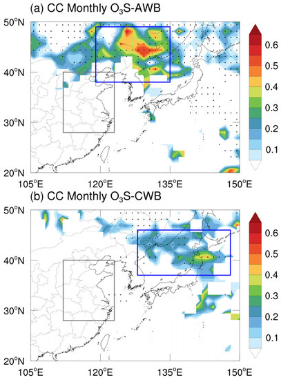 Horizontal distribution of correlation coefficients between regional monthly averaged O3S (CAM-chem) and frequency of AWBs (a) and CWBs (b) in eastern China, and only the areas that correlation coefficients passed the significance test (95%) are filled. The black dots mark areas that the frequency of RWBs exceeds 5. The gray rectangles outline eastern China. The blue rectangles indicate the regions that have both high correlation coefficients and a high frequency of RWBs.