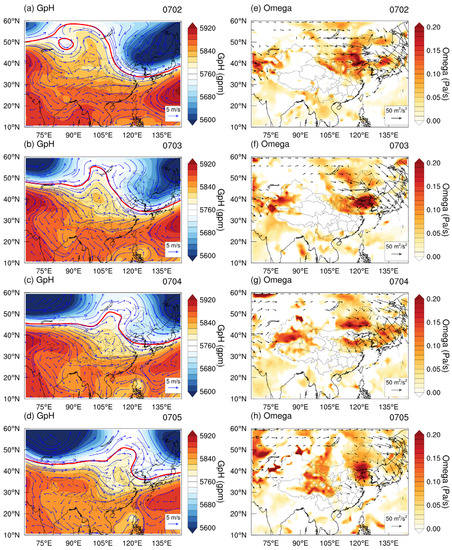 Time evolution of meteorological fields for Case 1. Left: Distribution of geopotential height (shaded) and horizontal wind (blue vectors) at 500 hPa from 2 to 5 July 2015 (a–d). The red lines represent the contour of 5770 gpm. Right: Distribution of Omega anomalies (shaded) at 500 hPa and horizontal T-N flux (vectors) at 300 hPa from 2 to 5 July 2015 (e–h). The vectors are drawn only in regions that the fluxes are larger than 15 m2/s2.