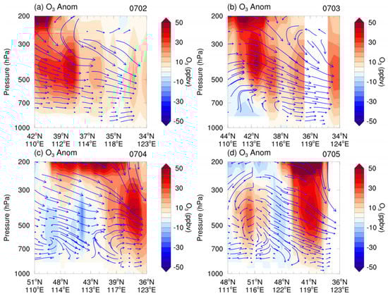 Vertical transection of ozone anomalies (shaded, from AIRS) and wind (vectors, from MERRA2) for Case 1 from 2 to 5 July 2015 (a–d). The transections were taken along the contour line at 5770 gpm, which are outlined by red lines in the right panels in Figure 3. The vertical velocities are multiplied by 50 times.