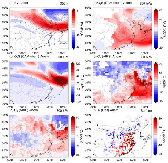 Composition fields of Case 2 during 30 to 31 August 2016. (a) PV anomalies at the 350 K isentropic layer. The regions shaded by slashes indicate PVy < 0. The blue vectors show the horizontal T-N flux at 300 hPa. (b,c) O3S anomalies from CAM-chem at 300 hPa and 850 hPa. (d,e) O3 anomalies from AIRS at 300 hPa and 850 hPa. (f) Observed nighttime O3 anomalies at the surface.