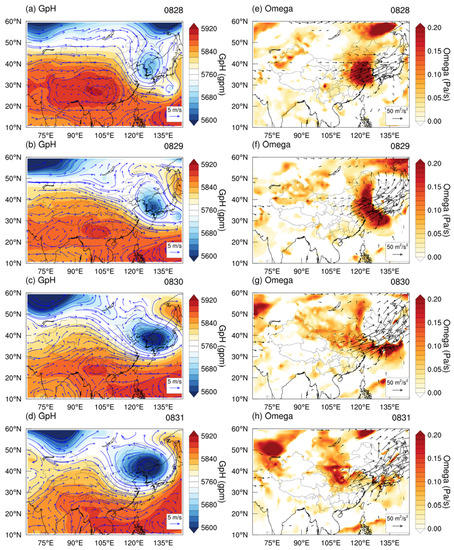 Time evolution of meteorological fields for Case 2. Left: Distribution of geopotential height (shaded) and horizontal wind (blue vectors) at 500 hPa from 28–31 August 2016 (a–d). Right: Distribution of Omega anomalies (shaded) at 500 hPa and horizontal T-N flux (vectors) at 300 hPa from 28–31 August 2016 (e–h). The vectors were drawn only in regions where the fluxes were larger than 15 m2/s2.