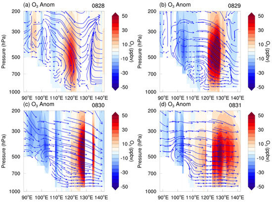 Vertical transection of ozone anomalies (shaded, from AIRS) and wind (vectors, from MERRA2) for Case 2 from 28–31 August 2016 (a–d). The transections are taken along the 35°N. The vertical velocities are multiplied by 50 times.