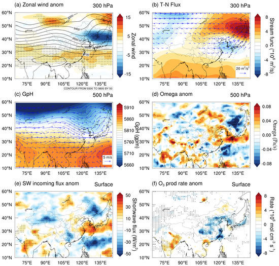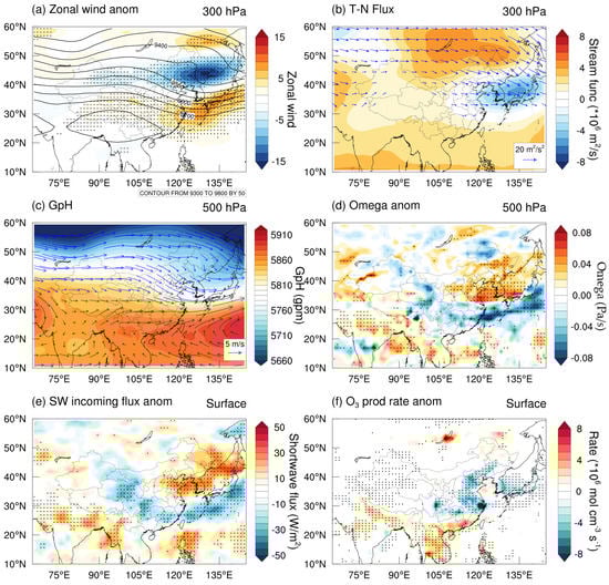 Horizontal distribution of composited anomalies of meteorological fields from MERRA-2 for all selected AWB events (33 days in JJA 2013–2020). (a) Zonal wind anomalies (shaded) and GpH (contour) at 300 hPa. (b) Horizontal T-N flux (vectors) and stream function (shaded) at 300 hPa. (c) GpH (shaded) and wind (vectors) at 500 hPa. (d) Omega anomalies at 500 hPa. (e,f) Surface incoming shortwave flux and ozone production rate anomalies. The black dots in (a,d,e) and (f) mark areas that the anomalies passed the significance test (95%). The vectors in (b) are drawn only in regions where the fluxes are larger than 5 m2/s2.