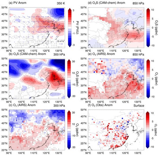 Horizontal distribution of composited PV, O3, and O3S anomalies for all selected AWB events (33 days in JJA 2013–2020). (a) PV anomalies at the 350 K isentropic layer (shaded) and horizontal T-N flux at 300 hPa (vectors). (b,d) O3S anomalies from CAM-chem at 300 hPa and 850 hPa. (c,e) O3 anomalies from AIRS at 300 hPa and 850 hPa. (f) Observed nighttime O3 anomalies at the surface. The black dots mark areas where the anomalies passed the significance test (95%) in each panel.