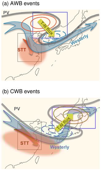 Figure 12. Schematic diagrams of AWB (a) and CWB (b) events and the subsequent STT processes. The gray lines indicate the PV contours. Green, blue, and red arrows denote the direction of horizontal T-N flux, westerly jet, and STT, respectively. The red and blue circles represent regions with positive and negative GpH anomalies, respectively. The gray and blue rectangles are the same as those in Figure 1. - (3)