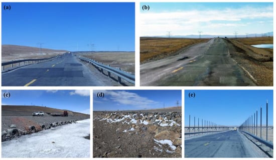 Local photographs of the QTH: (a) a photo of repaired pavement; (b) a photo showing embankment settlement; (c) a duct-ventilated embankment; (d) a block-stone embankment; and (e) a thermosyphon embankment.