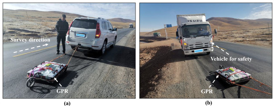 Diagram of the field GPR survey on the QTH: (a) the GPR survey system; (b) the safety vehicle.