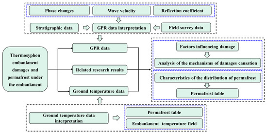 Figure 8 shows the research route’s flow chart. For our analysis and study, GPR data are used as the primary source, supplemented by multi-source data, and they are combined with these data. To create images that can be used for data interpretation, the GPR data are gathered and processed in a variety of ways. The interpretation of GPR images is based on wave velocity analysis, reflection coefficients (reflection intensity), and phase changes, and for areas with high water content, signal attenuation is also taken into account. The multi-source data mainly includes the following: ground temperature data, stratigraphic data, and field survey data. Where the ground temperature data allow the depth of thawing of the permafrost to be obtained for different periods and thus the permafrost table to be deduced for different periods. In addition, the temperature field in and around the embankment can be constructed from the ground temperature. The determined stratigraphic information can serve as a reference for stratigraphic stratification on GPR profiles; the on-site measured embankment height can be used as the foundation for separating embankment and natural surface; and the damage state of the highway can serve as a crucial foundation for the local abnormal GPR signal interpretation. The environment surrounding the embankment should also be carefully recorded, notably the water accumulation on both sides of the highway, which results in local water-rich areas in the active layers and the embankment. In addition, the results of earlier studies might be used as a guide when interpreting targets, particularly where there is a dearth of information or disagreement on targets.