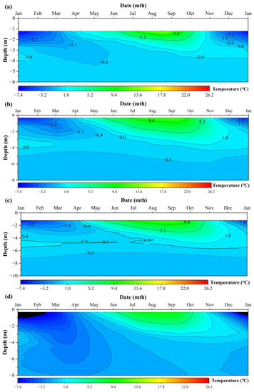 The ground temperature variation trend of the K2952 + 690 monitoring profile from 2002 to 2020: (a) monitoring hole of natural site; (b) monitoring hole of the left shoulder; (c) monitoring hole of the highway center; (d) monitoring hole of the right shoulder. Note: The data around 2013 in Figure 9a are missing due to equipment issues.