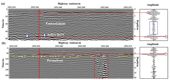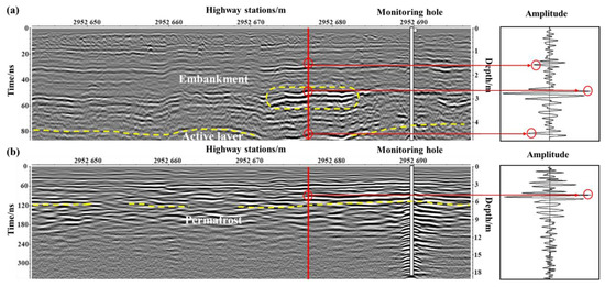 Figure 11 shows the GPR image and waveforms at typical locations of the K2952 + 643 to K2952 + 697 section, with the positions of the monitoring hole marked. According to the field investigation, the embankment is around 4 m high, the highway is severely damaged, and there is obvious local settlement of embankment as well as pavement repairs. Figure 11a shows a number of continuous reflections of the in-phase axis, with significant undulations, at depth ranges from 0 to 4.5 m in the GPR profile. A continuous reflection with obvious fluctuations appeared at a depth of about 4 m, which, when combined with electromagnetic characteristics and field survey data, represents the interface between the embankment and the natural ground (marked by the yellow dashed line at the bottom of the image). In addition, there is a strong reflection appeared at a depth of around 3 m (indicated by the yellow dashed box), and the lower part showed a misalignment of the reflection of the in-phase axis, so it was inferred that there is a possibility of localized loosening of the layers in the embankment here. Figure 11b shows cluttered GPR profiles, but it is still possible to see a reflection of the in-phase axis at about 6 m depth with weak continuity, a strong amplitude, and an unchanged phase, so it was inferred from the stratigraphic data (Figure 6d) and the ground temperature data (Figure 10c) that this is the permafrost table under the embankment. In addition, according to the GPR images, the permafrost under the embankment exhibited a discontinuous distribution and differences in the ice content.