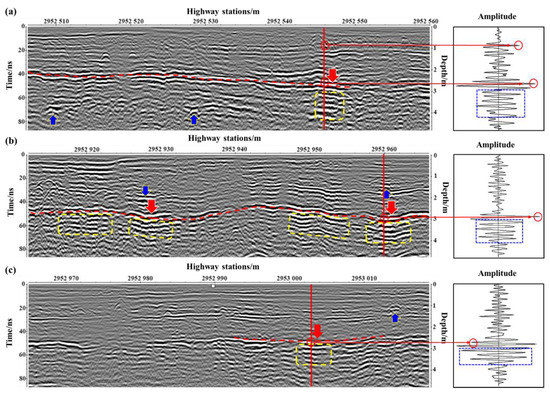 Figure 13a–c shows distinct strong reflections of the in-phase axis at a depth of about 3 m (indicated by the red dashed line), along with notable local enhancement and bending fluctuations, which are especially noticeable in Figure 13b. The yellow dashed box indicates where there are more areas of strong reflection. Additionally, in the upper portion of the area where strong reflections exist, the reflections are stronger in the reflections of the in-phase axis, and there is a clear characteristic of local settlement (indicated by the red arrow). The strong reflection areas indicated by the yellow dashed boxes are inferred to be loose areas according to the characteristics present in the GPR images, the electromagnetic wave characteristics (indicated by the blue dashed box in the waveform diagram), and their location. Localized settlement and other damages have resulted from the presence of these loose areas at the base of the embankment, and the settlement of these areas has caused localized layer loosening within the embankment (areas of strong reflections of the in-phase axis). Additionally, voids are suspected within small areas of the embankment (shown by blue arrows), and these voids pose a major safety hazard for the embankment. Therefore, the loose areas within the embankment, combined with the points discussed above, are the main cause of highway damage.