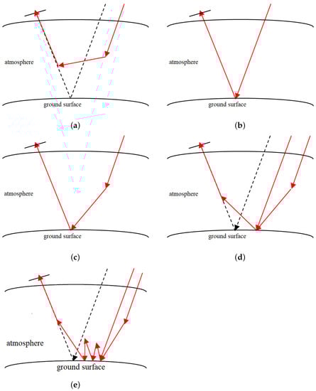 Algorithms for retrieving the ground surface reflectance from satellite measurements have been developed for more than four decades, starting from such studies as []. To date, there are dozens of ways for solving this problem. The algorithms based on the solution of the radiative transfer equation (RTE) are referred to as radiative transfer model (RTM) algorithms. Algorithms are developed for satellite sensing of both land and water surfaces. The material presented below is primarily related to the problem of land sensing under conditions of a cloudless atmosphere. The problem solution for the water surface has its own specificity. The reflection from water surfaces is considered specular, in contrast to most land surfaces. According to [], the received radiance in ocean remote sensing consists of: (1) radiation that did not interact with the water surface, (2) specularly reflected solar radiation, (3) radiation reflected by foam and whitecaps, and (4) radiation scattered by the upper water layer. Water surfaces are horizontally more uniform than land areas. Therefore, water surface can be treated as horizontally uniform when inverse problems of sensing are solved. In general, the state-of-the-art in algorithms for sensing of water surfaces can be judged from [,,,]. According to [], a signal received by a satellite receiver in the visible and near-IR ranges can be divided into the following components (Figure 1): (1) radiation that does not interact with the ground surface (Figure 1a), (2) direct solar radiation that interacts with the surface fragment under study (Figure 1b), (3) diffuse solar radiation that interacts with the surface fragment under study (Figure 1c), (4) adjacency effect (AE) due to single reflected radiation (Figure 1d), and (5) adjacency effect due to multiple reflected radiation (Figure 1e).