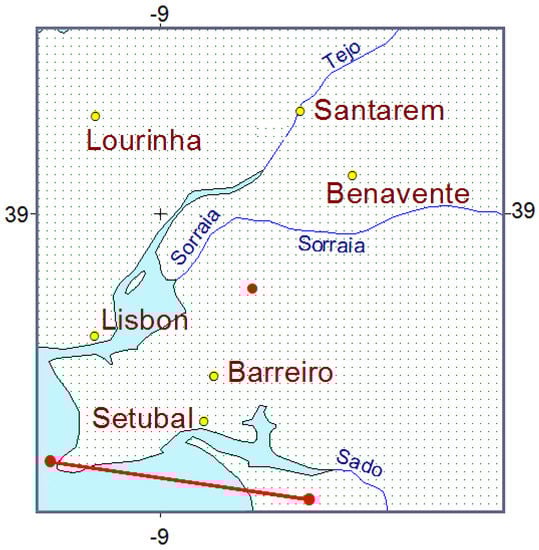 Test surface area with the coordinates 38.4–39.4N, 8.25–9.25W. The red dot is for the test site with the coordinates 38.829N, 8.791W, for which the results of ground-based measurements are reported in []. A red line is drawn from the pixel with coordinates 38.351N, 8.660W to the pixel with coordinates 38.438N, 9.247W.