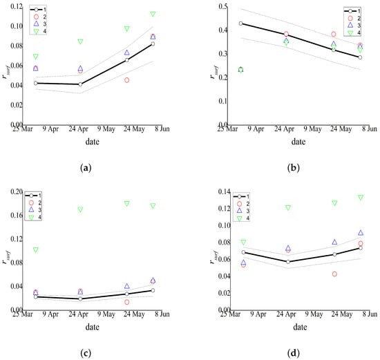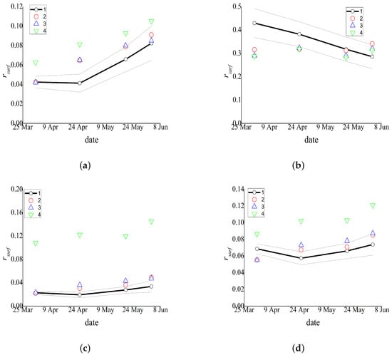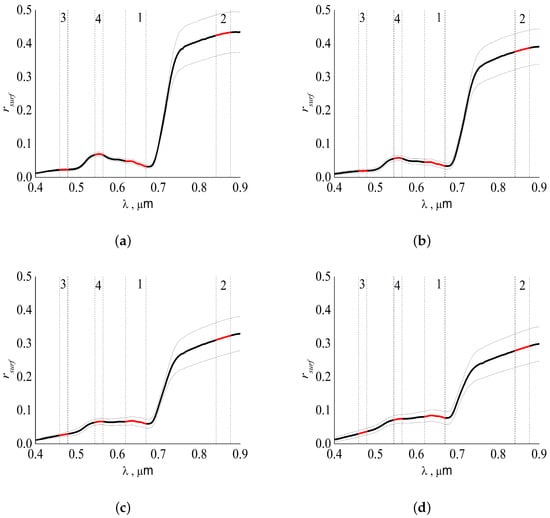 Ground-based measurements of reflectances of the surface area with coordinates 38.829N, 8.791W []: (a) 1 April 2016; (b) 25 April 2016; (c) 20 May 2016; (d) 3 June 2016. Numbers 1–4 are the numbers of the MODIS bands; thick lines are the average reflectances; thin lines are their standard deviations.