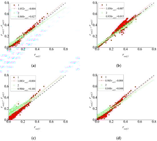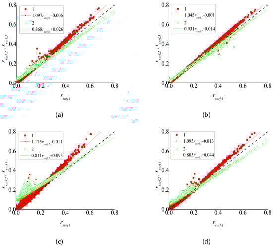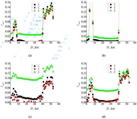 According to the algorithm [], the non-Lambertian character of the ground surface can be taken into account once the ground surface reflectances are determined in the approximation of Lambertian reflection. The most common way to take into account the non-Lambertian character of the surface is by using the Ross–Thick–Li–Spars model []. Alternative BRDF models were presented in works [,,,,]. The analysis of earlier publications shows that the simultaneous consideration of surface topography and reflection inhomogeneity was not performed in the solution of the inverse problem. Knowing surface slopes (from, for example, Ref. []), we can normalize the surface before performing the atmospheric correction or use corrections for surface topography in the systems of equations to be solved.