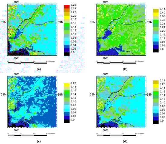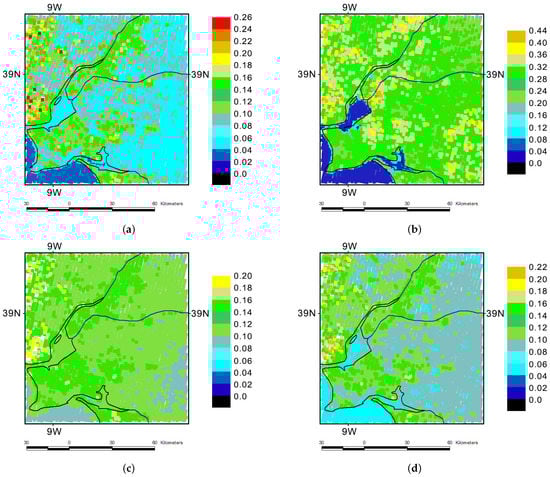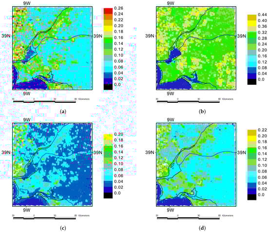 The use of approximation (16) is justified in the Supplementary Materials []. The use of approximation (16) for the situations considered below has an error no more than 1.5% for MODIS bands 1, 3, and 4 and no more than 3% for MODIS band 2. This leads to the absolute errors in retrieval of no higher than for band 1, for band 2, for band 3, and for band 4 for the area considered below.