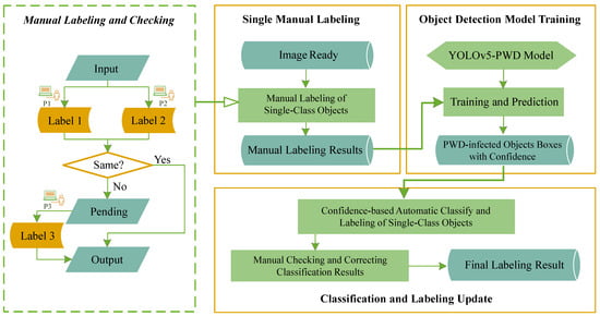 In this study, the classification of Pine Wilt Disease (PWD) infected trees into two categories, the middle-stage and the late-stage, was carried out based on the characteristic color changes of infected trees in the respective stages, as revealed by previous studies [36,37,38]. A manual annotation strategy (Figure 2) was implemented to produce the dataset, which consisted of three steps: Single Manual Labeling, Object Detection Model Training and Classification and Labeling Update.