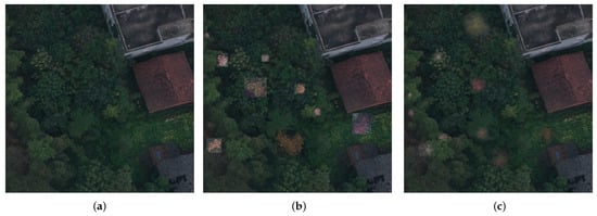 An example of synthetic images with different synthesis strategies. (a) Without infected trees; (b) Synthesis by Direct Synthesis; (c) Synthesis by Weighted synthesis.