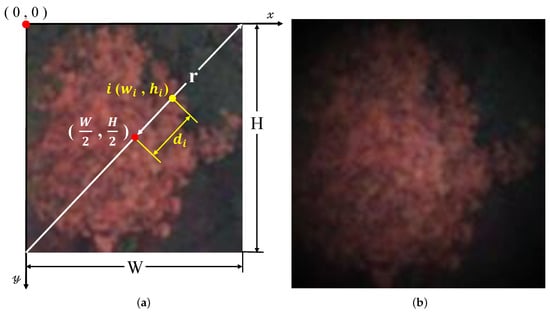 where represents the pixel value of point i in the weighted infection tree target frame image; represents the pixel value of point i in the unweighted original infection tree target frame image; represents the pixel value of point i in the background image; is the weight value to be increased; W represents the width of the target frame image of the infected tree; H represents the height of the target frame image of the infected tree; represents the coordinate at point i when the top left vertex of the target frame image of the infected tree is . These are shown in Figure 7a, where r represents half of the diagonal length of the target frame image of the infected tree, which is the distance from the center point of the target frame image to the four vertices; represents the distance from point i to the center point in the target frame image of the infected tree. When the point i is closer to the center point, the value of is smaller and the value of is larger, the feature information of the target frame image of the infected tree retained at the point i is more, and the feature information of the background image retained at the point i is less. When point i is at the edge of the target frame image of the infected tree, the value of is larger, the value of is smaller and the value of is larger, the feature information of the background image retained at the point i is more, and the feature information of the target frame image of the infected tree retained at the point i is less.