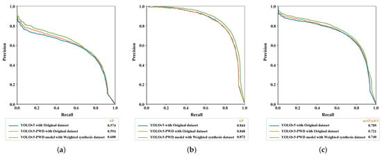 The P-R curves of the YOLOv5 and YOLOv5-PWD models on the test set. (a) The detection results of middle-stage infection trees; (b) The detection results of late-stage infection trees; (c) The detection results of two classes infection trees.