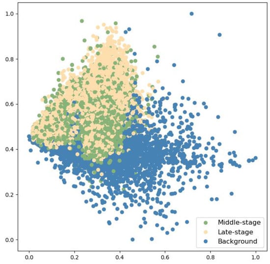In this paper, we present a PWD-infected tree sample dataset. This dataset consists of 1853 images and 51,124 infected trees. We divided the infected trees into middle-stage and late-stage categories, with 28,400 and 22,724 targets, respectively. In order to observe the distribution of samples of different categories in the dataset, we additionally randomly cropped 15,000 targets as background, which together with the middle-stage infection tree targets and late-stage infection tree targets constitute a sample feature dataset. We use the t-Distributed Stochastic Neighbor Embedding algorithm (t-SNE) [49] to reduce the dimensionality of the sample features of this dataset, and finally obtain a visualized data distribution result (as shown in Figure 9). As Figure 9 shows, there is a clear distinction between the background targets and the infected tree targets in our sample data set, which can make the model better classify the infected trees and the non-infected trees. However, it also reveals that the distinction between categories of middle-stage infected trees and late-stage infected trees is not obvious. Therefore, effectively distinguishing between middle-stage infected trees and late-stage infected trees has become one of the challenges of the model for detecting PWD-infected trees.