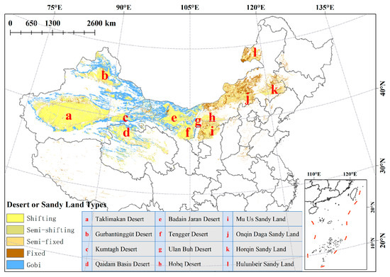 Study area overview. The map includes the types of deserts in China and the specific locations of the eight major deserts and four major sandy land areas. The data set was provided by the Environmental and Ecological Science Data Center for West China, National Natural Science Foundation of China (http://westdcwestgis.ac.cn, accessed on 2 February 2022). Review Number: GS (2020) 4619.