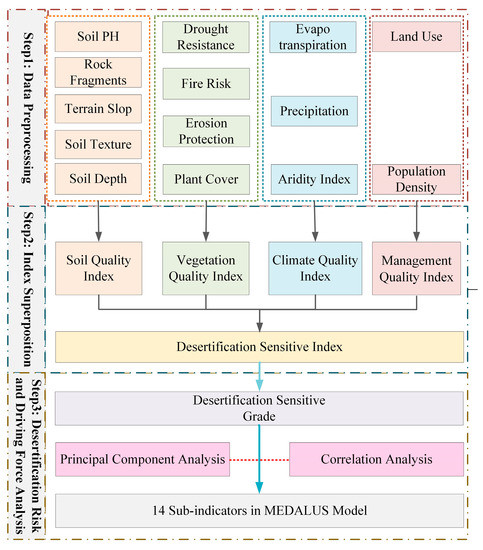 Flowchart of land desertification sensitivity assessment in China, modified from Ferrara et al. [28].