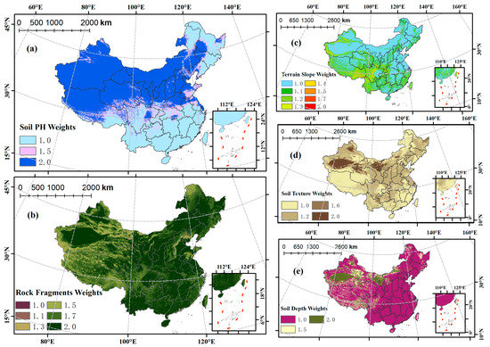 Soil quality sub-index classification results. (a) The result after classifying and assigning weights to soil pH; (b) the result after classifying and assigning weights to rock fragments; (c) the result after classifying and assigning weights to terrain slope; (d) the result after classifying and assigning weights to soil texture; (e) the result after classifying and assigning weights to soil depth.