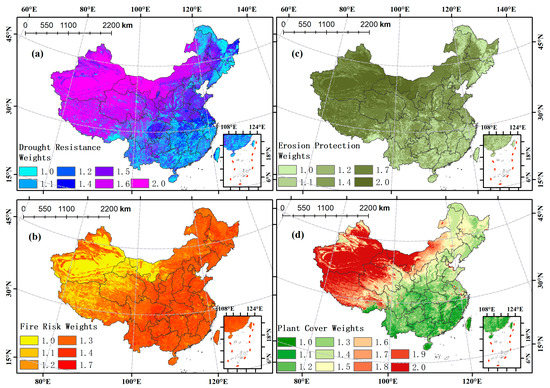 Vegetation plays an important role in climate regulation, soil and water conservation, and wind and sand control, etc. It reduces runoff by promoting water infiltration and reduces soil erosion by improving soil structure and strengthening soil cohesion [46]. Based on the MEDALUS model, four indicators (drought resistance, fire risk, erosion protection, and plant cover) were chosen to assess the quality of the vegetation cover. Based on the Jenks natural breaks classification method and MEDALUS model, these four indicators were classified and assigned weights (Table 3); the classification results are shown in Figure 4.