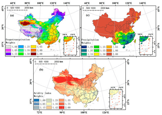 Climate quality sub-index classification results. (a) The result after classifying and assigning weights to evapotranspiration; (b) the result after classifying and assigning weights to the aridity index; (c) the result after classifying and assigning weights to precipitation.